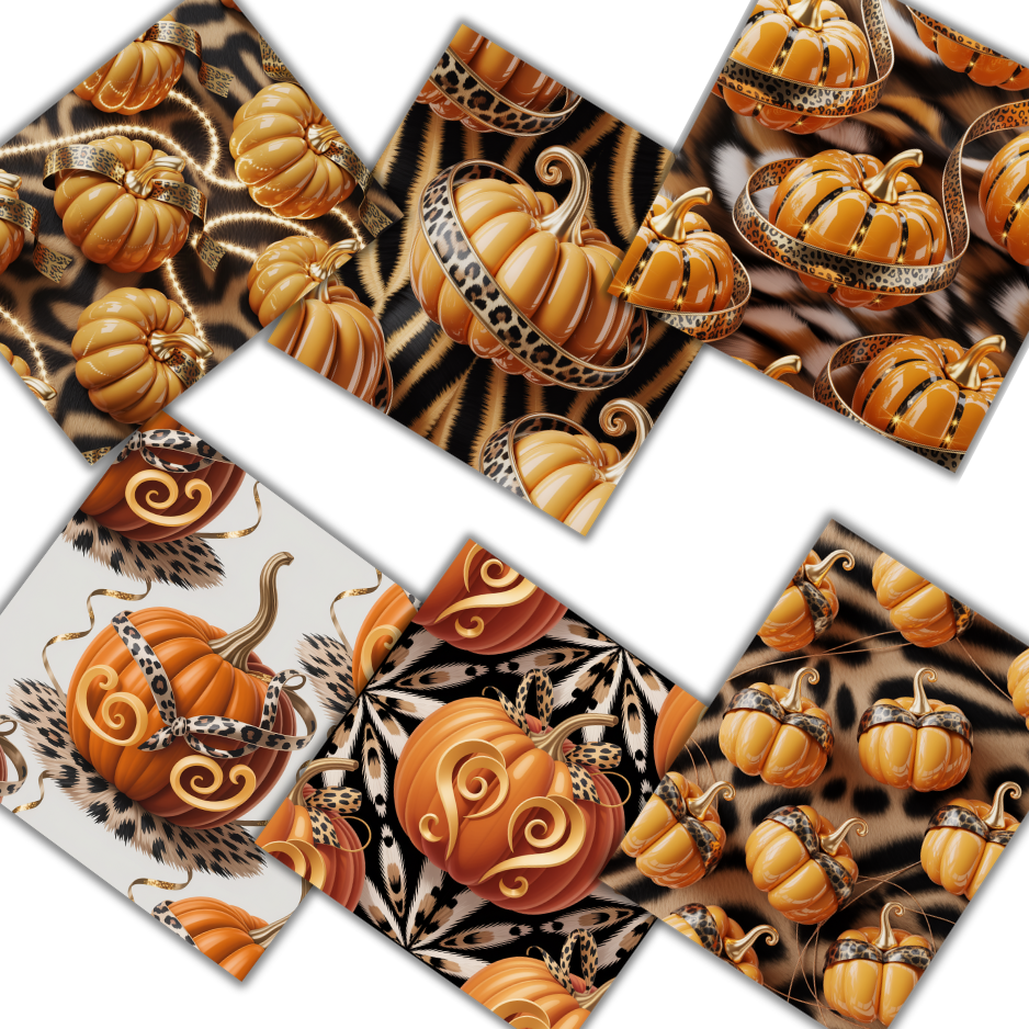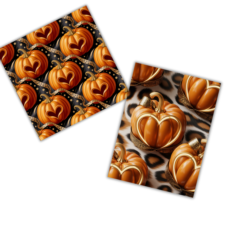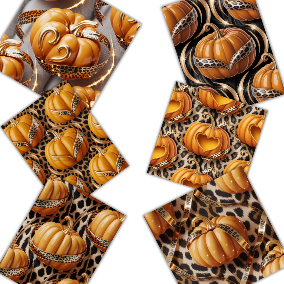 Each design features rich orange pumpkins carved with heart-shaped centers, paired with stylish leopard-print ribbons, shimmering gold accents, and a bold black backdrop — creating a striking, upscale fall aesthetic that works beautifully for both seasonal and year-round projects.